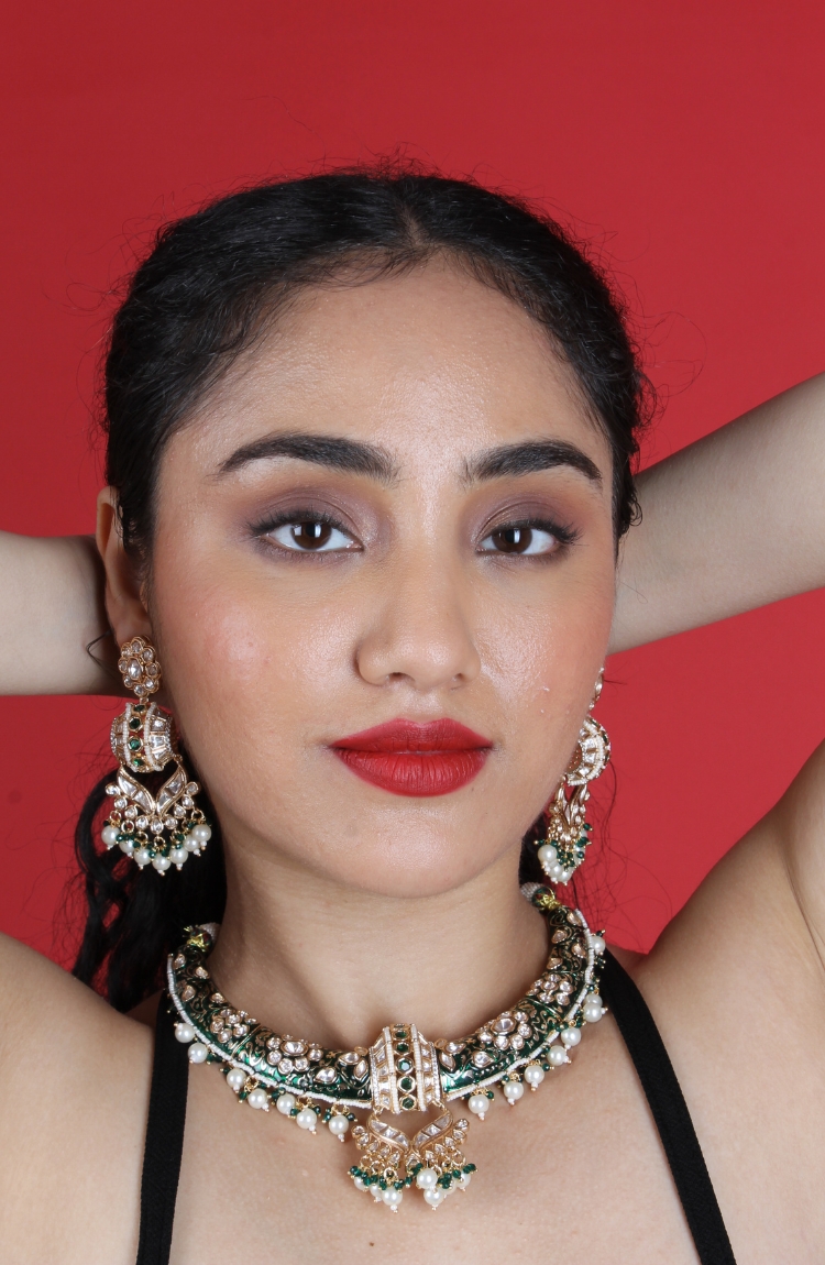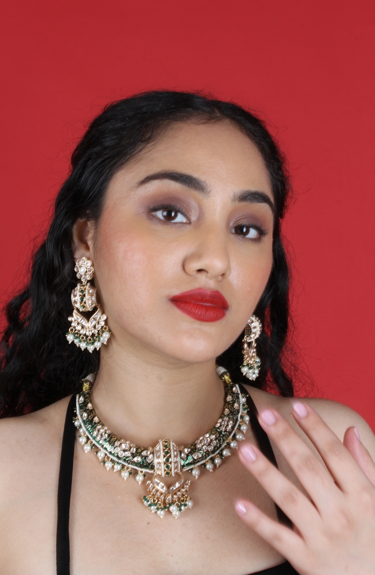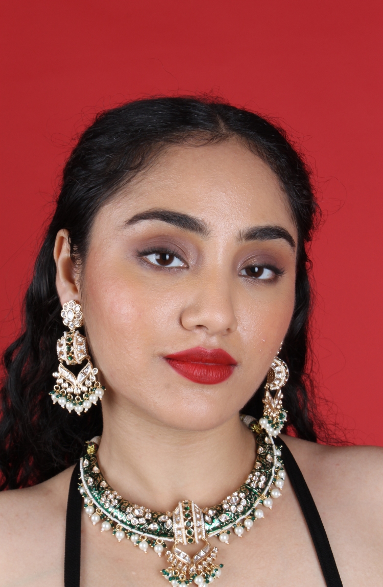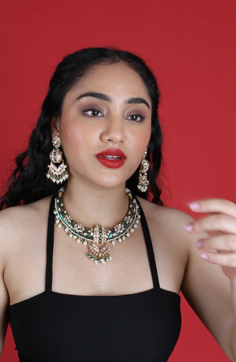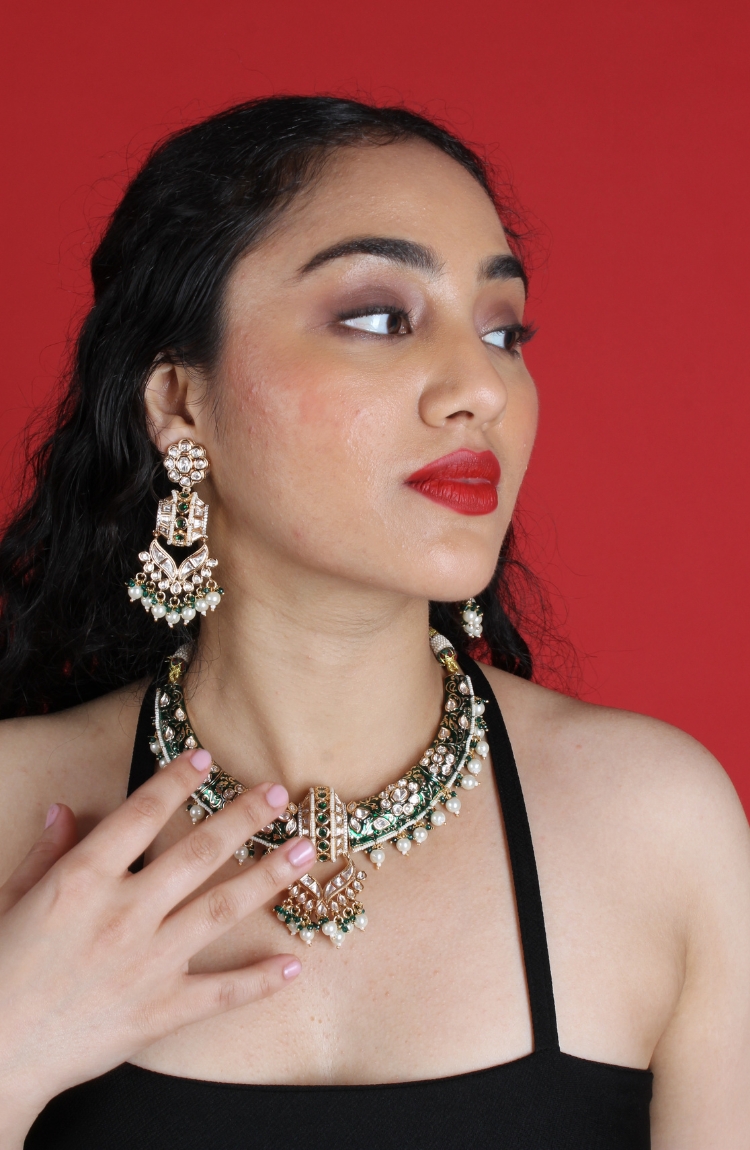 - Dimensions: Long Necklace Length: 37.4 cm X Width: 5 cm; Short Necklace Length: 27 cm X Width: 3.3 cm; Dangle Earrings Length: 4.7 cm X Width: 2.3 cm; Stud Earrings Length: 1.3 cm X Width: 1.3 cm; Weight: 203.66 Grams