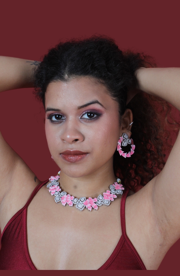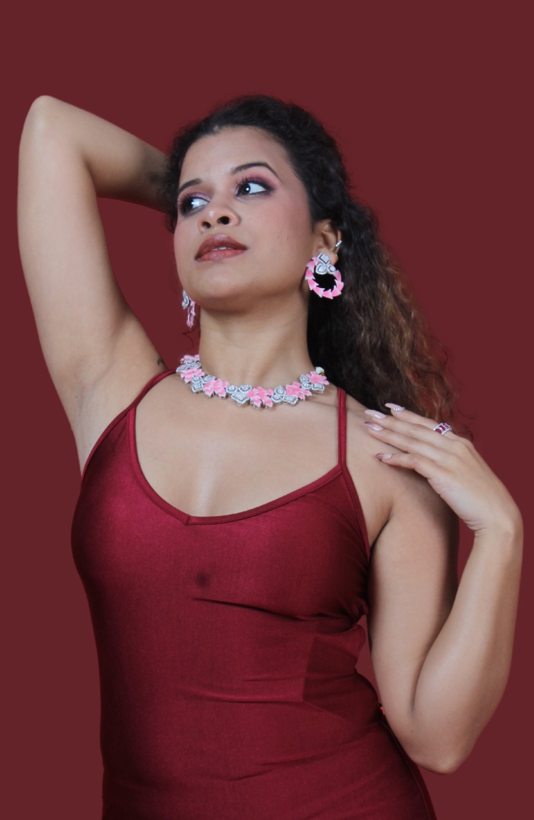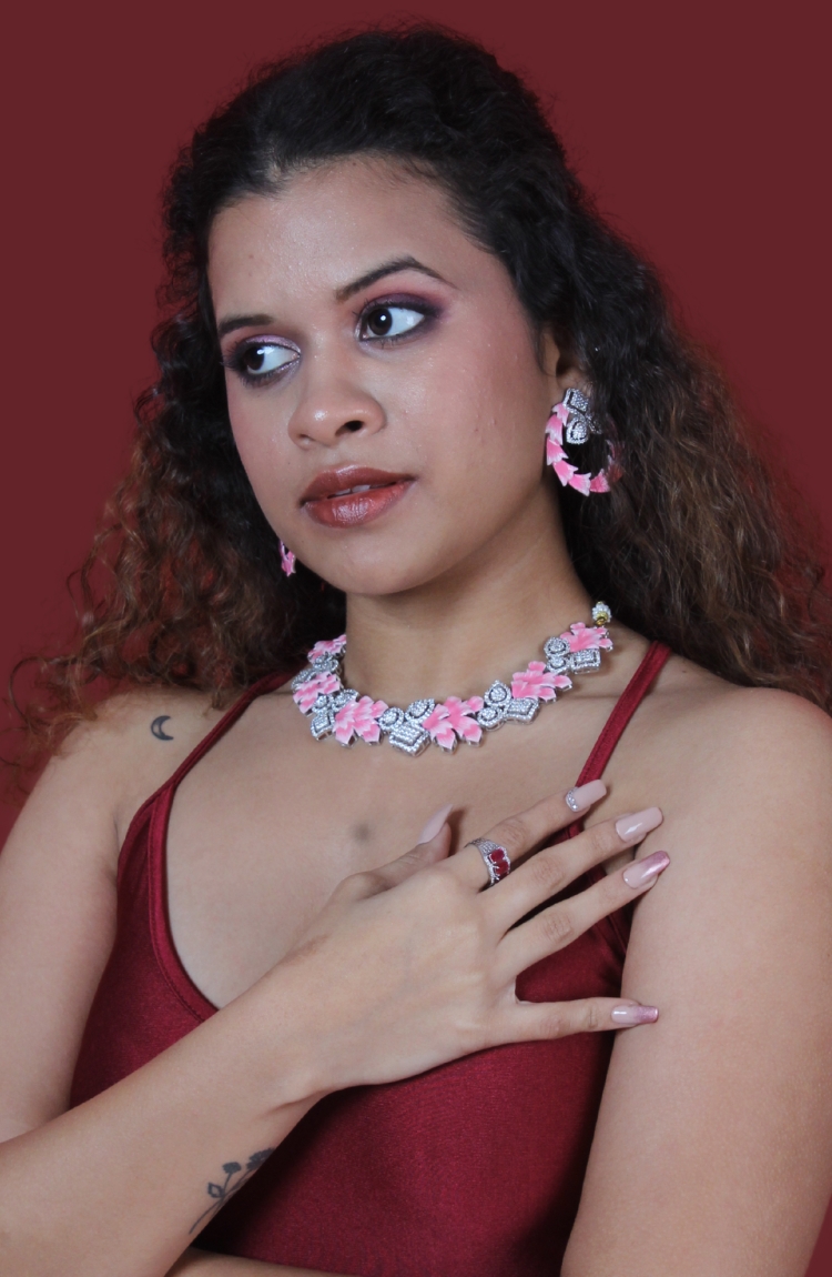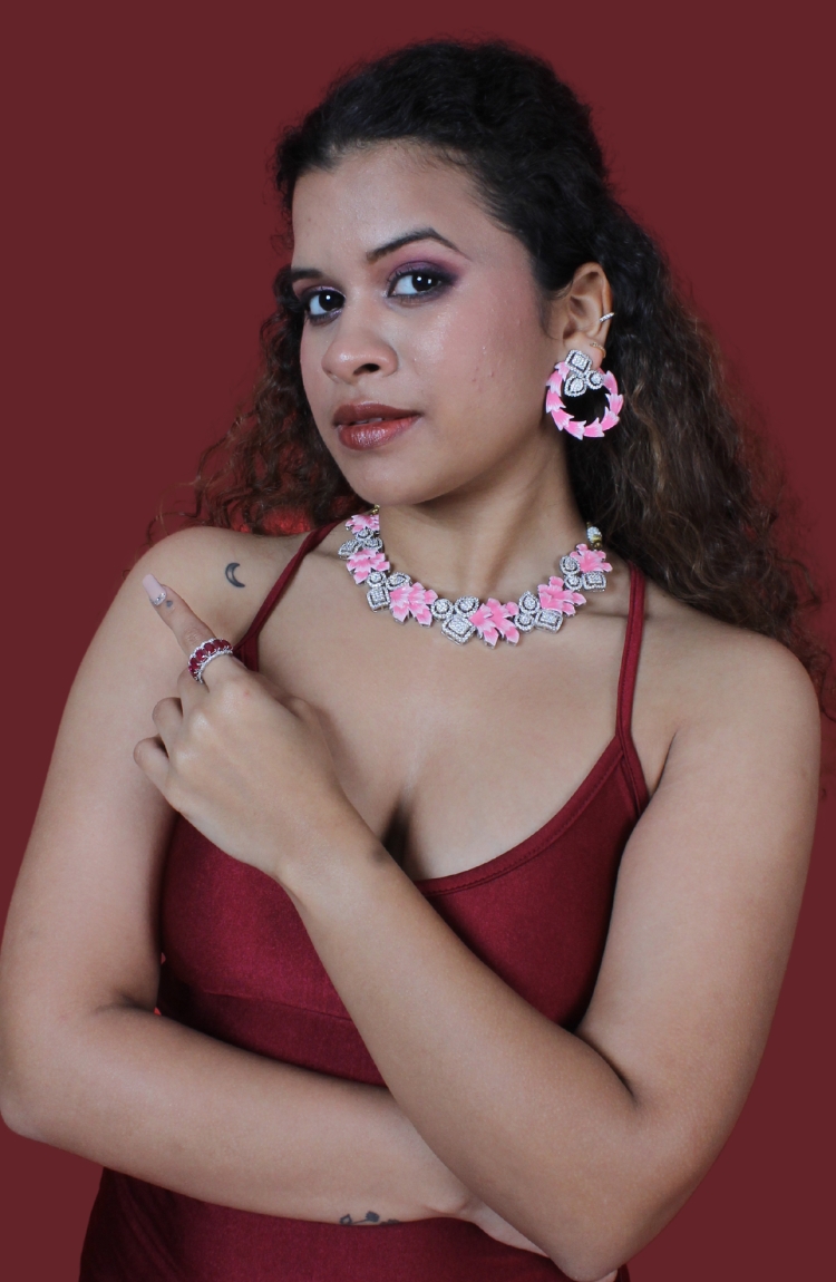 Pink And Silver Crystals Necklace Set with Earrings for Women